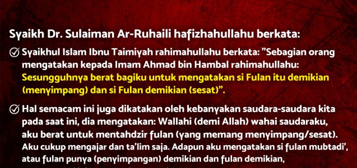 Syaikh Dr. Sulaiman Ar-Ruhaili hafizhahullahu berkata:▶️ Syaikhul Islam Ibnu Taimiyah rahimahullahu berkata: “Sebagian orang mengatakan kepada Imam Ahmad bin Hambal rahimahullahu: Sesungguhnya berat bagiku untuk mengatakan si Fulan itu demikian (menyimpang) dan si Fulan...